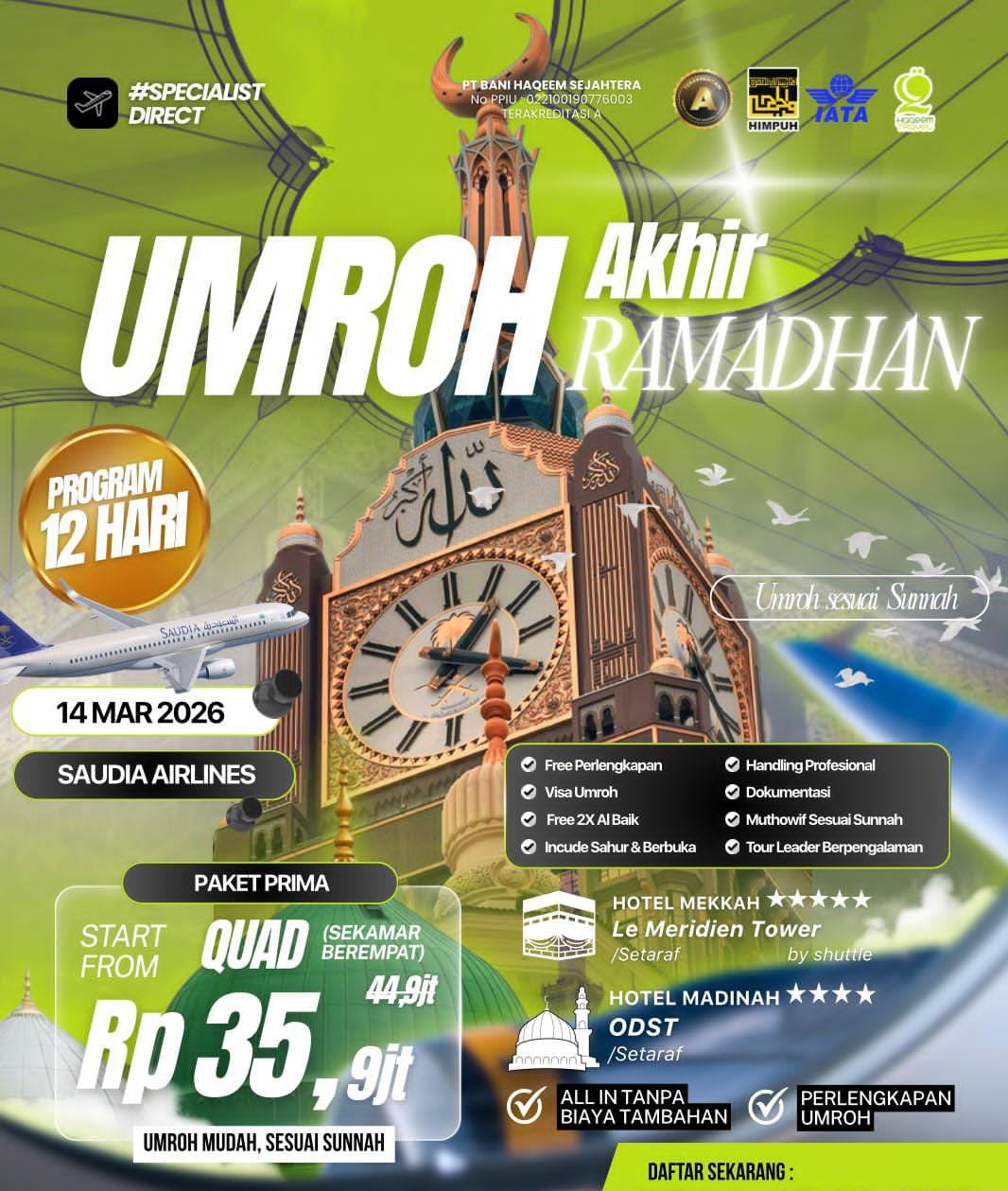Bagi anda yang sedang mencari Paket Umroh Akhir Ramadhan 2026, kami dari Haqeem Travel siap melayani anda umat muslim Indonesia ke tanah suci dengan pelayanan dan fasilitas terbaik dan biaya Umroh yang Kompetitif juga di bimbing oleh Tour Leader dan Muthowif yang sudah sangat berpengalaman yang siap membantu anda 24 Jam.